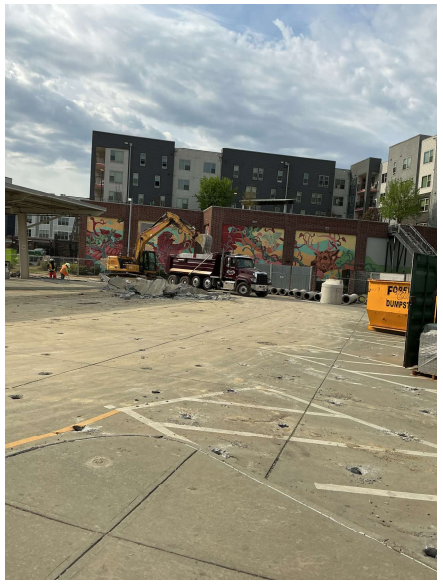 Construction crews continue to move efficiently, carefully dismantling the old structure and clearing the way for the new.